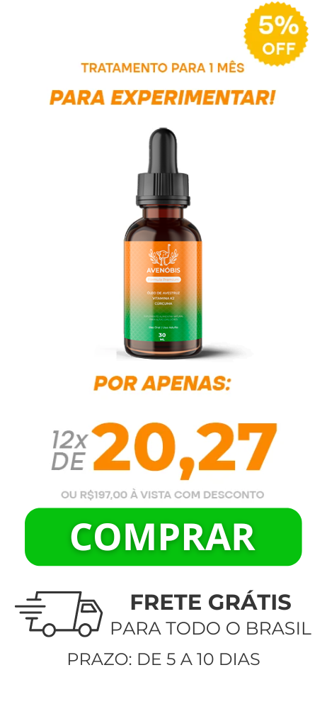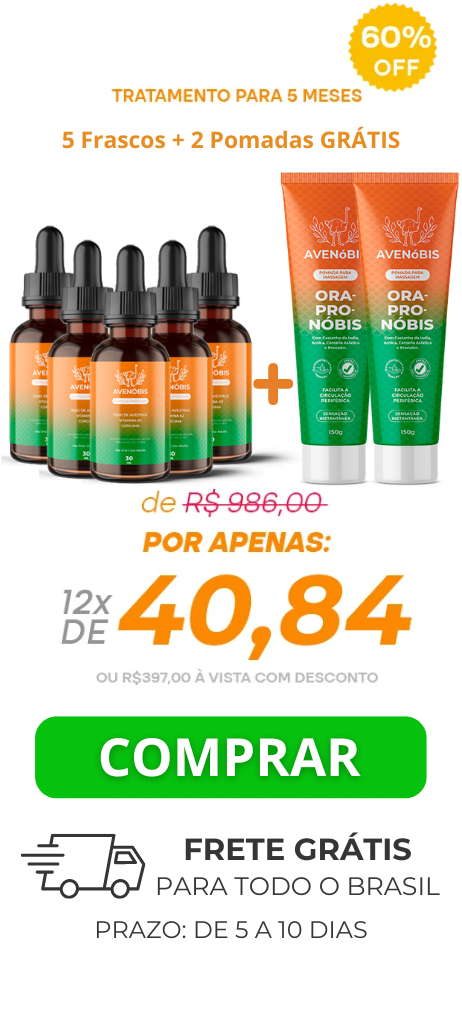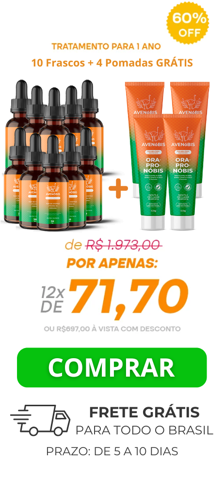 Tome 12 gotas pela manhã em jejum do Avenóbis Gotas, aplicando abaixo da língua para melhor absorção. Se quiser, pode aplicar numa colher e depois inserir na boca para maior facilidade e controle da dosagem. Para potencializar o resultado, aplique o Avenóbis Pomada nas regiões doloridas e massageie suavemente, duas vezes ao dia: de manhã e à noite antes de dormir. Não precisa exagerar na quantidade, pois ele espalha muito bem!